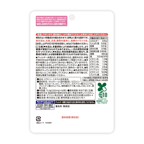 葉酸400㎍と鉄など合計9種のビタミン・ミネラル配合。