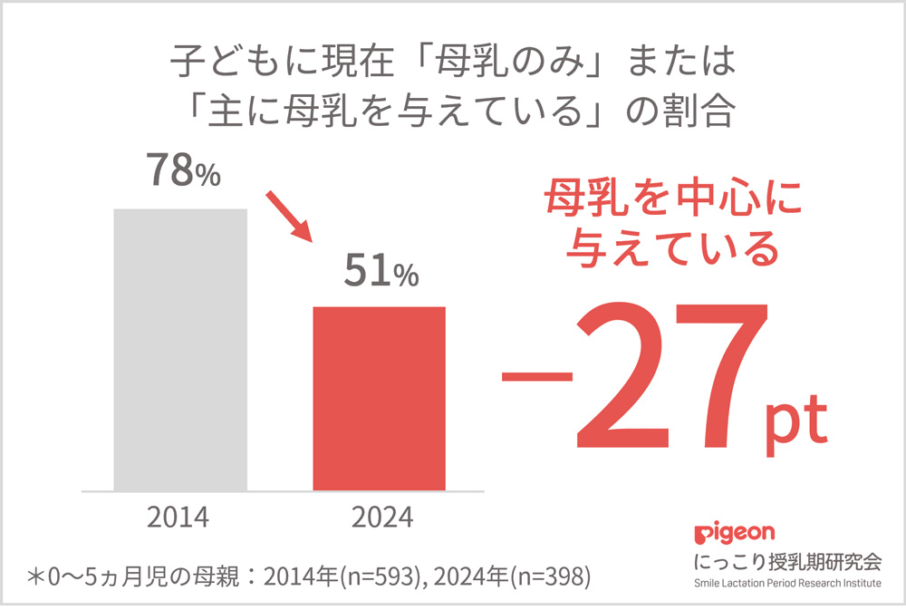 2024年「授乳期母子状況調査(*1)」の結果によると、0~5ヵ月児の母親の82%が母乳を与えている一方で、「母乳のみ」または「主に母乳を与えている」割合は10年前と比較して27ポイント減少していました (78%→51%)。